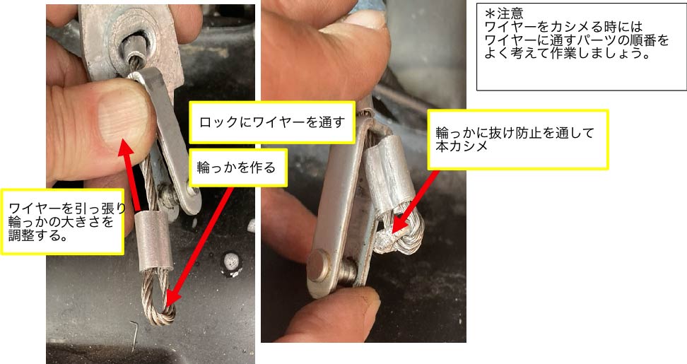 ワイヤーは最初から作りかえる。まず、クラッチペダル側(断裂していない側)にある金具を再利用し、ワイヤーを通す。詳細は以下を参照。