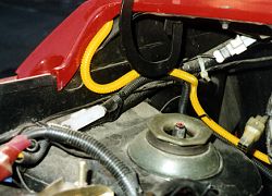 正しい位置というと、掲示板で聞いた話によるとECU(コンピュータ)が入っている所ですね(運転席後方下側の蓋を開ける)。私は未確認なので言い切れないところではありますが・・(^^;;。とりあえず、言い切ってしまって話を進めましょう。ECUから出ているハーネスに沿うようにしてバッテリーの方までハーネスを伸ばしましょう。