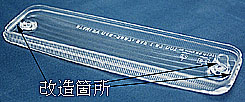 レンズの裏面に出っ張りが2カ所あるが、高い方を低い方と同じくらいの高さになるまで削り取る。さらにタッピングビス用の穴径をリーマーで若干大きくする。そのとき、高い出っ張りのあった方の穴の方向を鉛直方向に修正しながら大きくする。低い方は、すでに開いている方向に従って大きくする。
