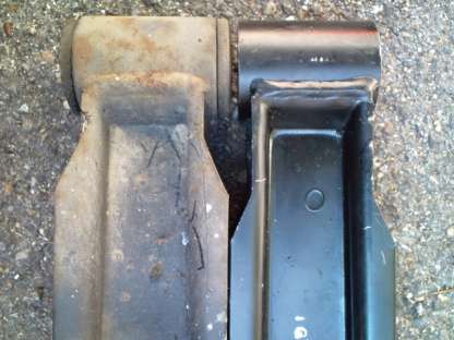 スタビライザ取付部のアップ、これは変形の無かった左側ロアアームとの比較です。