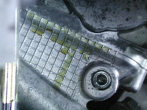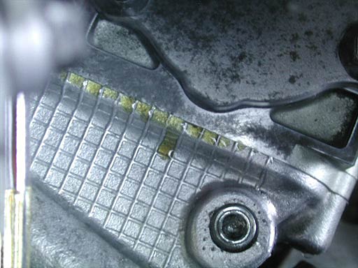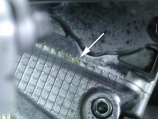 直接見えない箇所なので、鏡に反射させて見た画像を掲載する。赤い線の部分がカムカバーとシリンダーヘッドとの境である。
