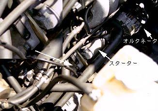 2.オルタネータ等につながっている配線を外す(矢印部分)。