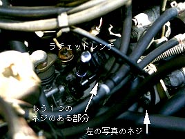 3.スターターの固定されているネジを外す。2カ所で止められている。1カ所は見えないところにあるので、工具を突っ込んで探す。位置は右の写真でラチェットレンチが入っているあたりだ。