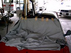 ガラスを外した後。室内に火花が飛ばないよう、防火布で覆われています。