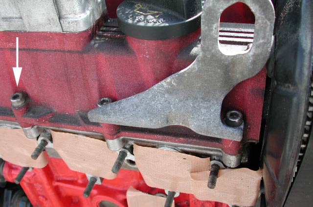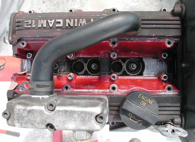 さすがに薄汚れているが、カムカバーは赤。矢印部分のネジはステンレス製だ。見た目は綺麗なのだが、変なところに落とすと磁石にくっつかないから面倒なことになる。