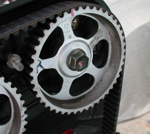 プーリーにはいろいろマークが書いているが、元々なのかどうかは不明。というのもこのエンジン、タイミングベルトの交換のため、カムカバーだけは取り外した履歴があるからだ。