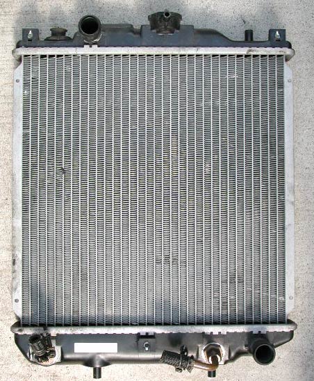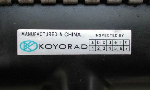 コーヨ−ラド製のラジエターには、OUT側にシールが貼ってある。ヤフオクで出品されている中古ラジエターを見ると、特にアルトやミラでは社外品の割合が高い。普通車のラジエターの出品物は社外品が少ないため、軽自動車のラジエターは純正がすぐにダメになる(安く作ってある)ということなのだろうか。