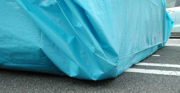 テープの位置が、車が浮くとされる地上から50cmの位置。ブルーシートにくるむことで、50cm以上の高さを確保している。ということは、くるんでしまうと水は入らないがプカプカ浮く??