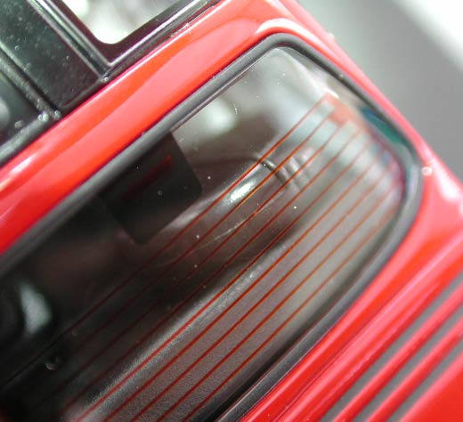 が、このハイマウントストップランプ、普通とは様子が異なる。これ、ハイマウントストップランプの形をしたパーツが内部についているのではなく、リアウインドウの一部を塗装もしくは赤色のフィルムを貼り付けてハイマウントストップランプっぽくしたものなのだ。実際に角度を変えて撮影すると、光の透過で赤くなる。
