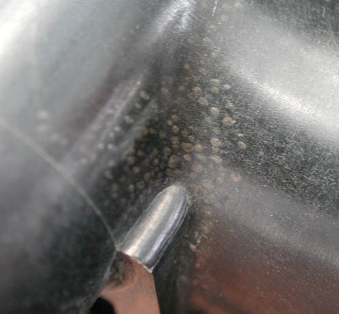 例の模様が出ている部分を、タンク内部側から撮影したところ。これまた特段問題は無い。
