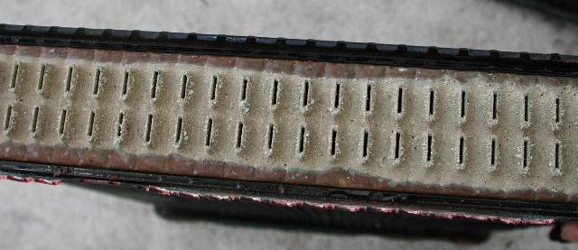 OUT側タンクの外部表面にはシャシーブラックがかかっていたので、表面をみてもあまり参考にならない。写真矢印部分はシャシーブラックが付着したドレンコック。