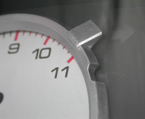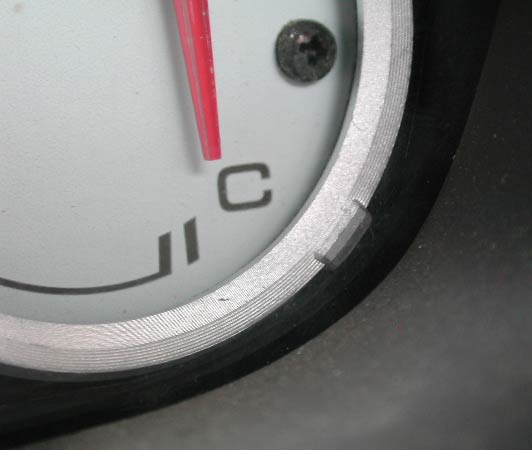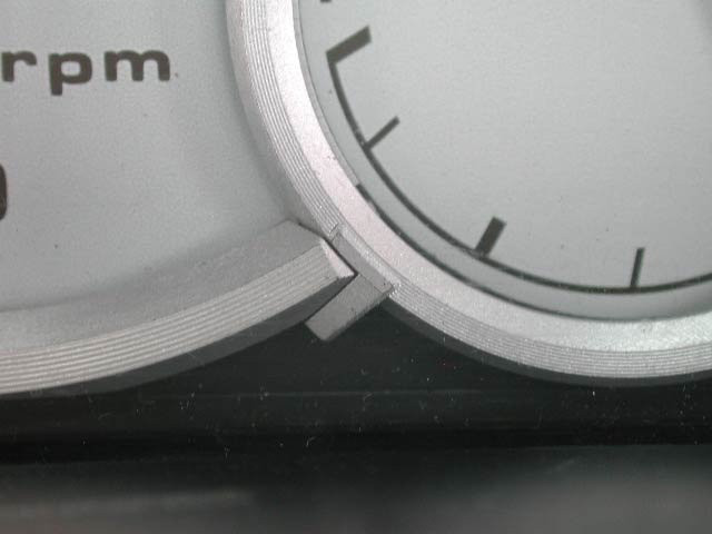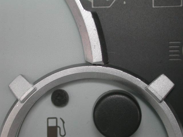 タコメーターと燃料計の境。この部分は、タコメーターの上に燃料計のリングが重なるようになっている部分だ。作りが細かいなあ。