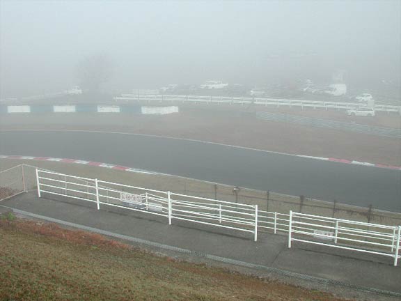 サーキットに行くまでの高速道路では霧がかかっていた。ICを降りて少し走ったら霧が晴れたのだが・・・サーキットには霧がかかっていた。
