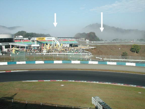 時間の経過とともにサーキット内の霧は晴れていったが、山の方はまだかかっている。