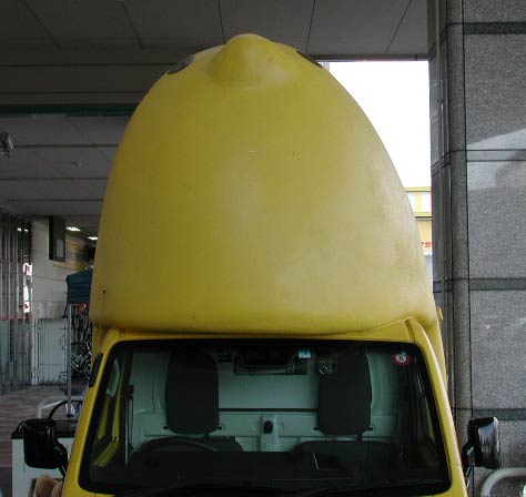もう1つ聞いてみた。はっぴよカーの乗り味である。特に風の影響を受けそうな・・・案の定、風でハンドルを取られるとのこと。そりゃこんなでかい垂直翼状のものが、しかも歪んでついていたら、風の影響を受けないはずがない。