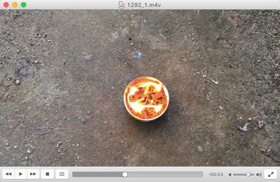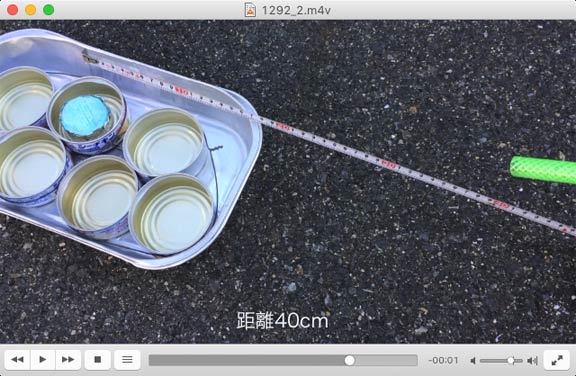 次に消火を行うに際し、消棒RESCUEもどきと火元との距離を設定した。火元に近づくほど消火しやすくなるため、一定の距離を設定しないと条件を一定にした評価ができない。今回行う一連の評価では、固形燃料1ヶが消火できる最長の距離を設定した。具体的には40cmとなった。火元に徐々に近づけていき、火が消える様子を下のムービーに示す。
