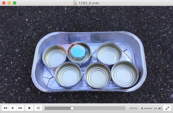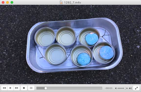 ツナ缶3つの場合。固形燃料は3つ入りで売られていたので、今回の試験では、これを最大ヶ数とした。あっさり消えた。消え方は、燃料炭を入れたツナ缶3つの場合とあまり変わらないように見える。
