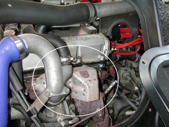 さらにエキマニより少し離れたインタークーラーにも、線香を置いた。インタークーラーから出火する可能性は極めて低いと思われるが、広い範囲での二酸化炭素の流れを見える化するため、ここにも設置した。