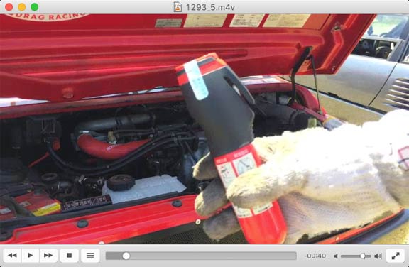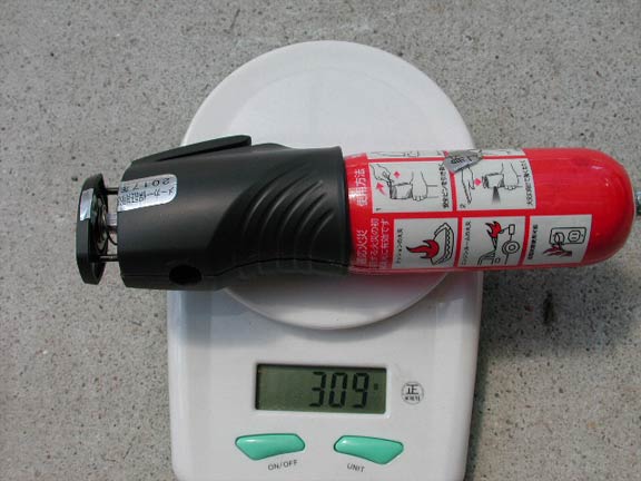 ここで紹介するのは消火実験ではない。単純に二酸化炭素の噴射実験で、消棒レスキューもどきと差がないことを確認する確認試験である。着目して欲しいのは噴射時間と噴射時の音。なお消火実験は別途紹介する。