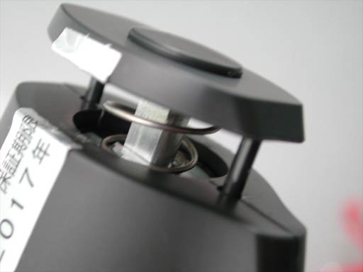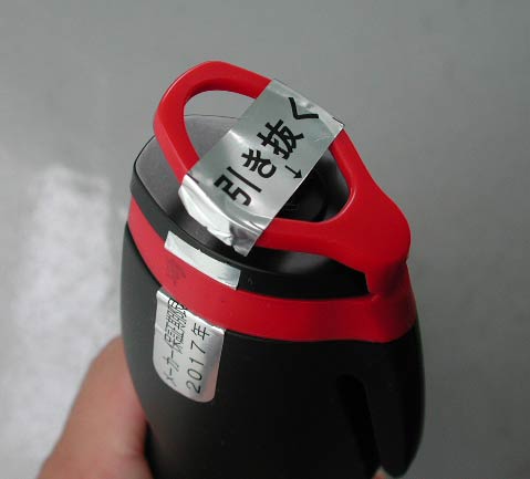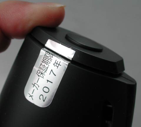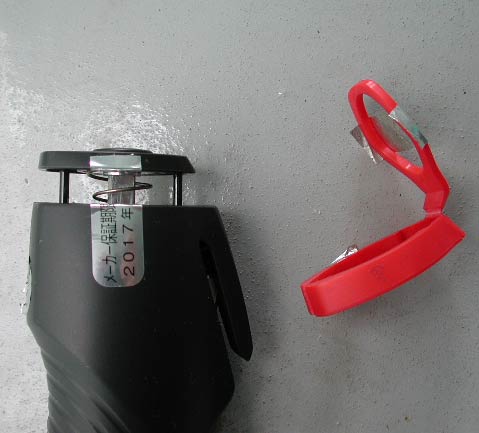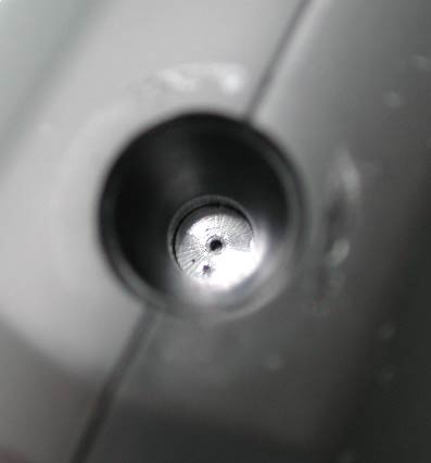 噴射口の封印。噴射済みのため一部が破れている。封印を完全にとると、実際の噴射口が見える。かなり細い。