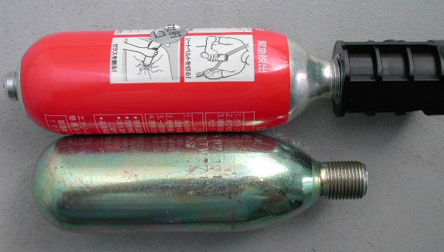 写真上が消棒RESCUE、下が消棒RESCUEもどきに使用した二酸化炭素カートリッジ。どう見ても同じである。