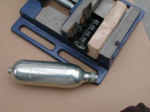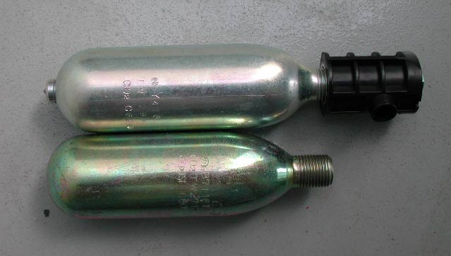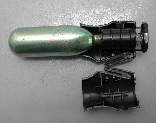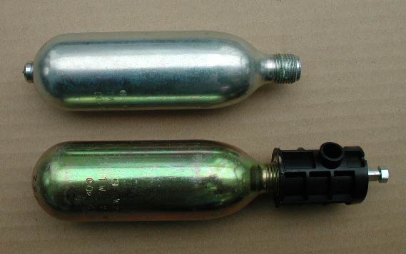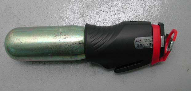 プラスチック部分を、消棒RESCUEもどきに使った二酸化炭素カートリッジに付けてみた。写真上が、本物の消棒RESCUEに使われていたボンベ、下が消棒RESCUEもどきのカートリッジに頭を取り付けたところ。問題なく付いた。