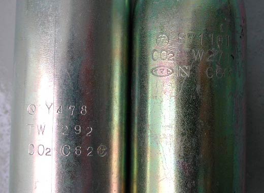 消棒RESCUEに貼ってある赤いフィルムをとり、再度比較する。ボンベに打ってある刻印を見ると、全く同じではないが、似たような感じだ。
