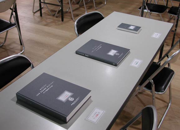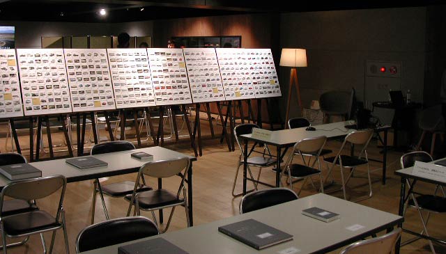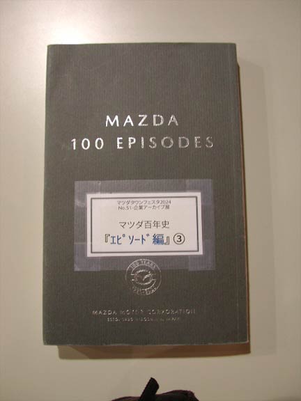 最初に紹介するのが、企業アーカイブ展。下の写真では、立てかけてあるパネルで歴代マツダ車が紹介されているんだろうなあと想像がつくが、手前の机の上には何やら本が置いてある。