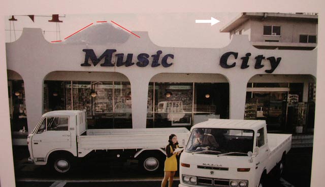 ストリートビューでよくよく探すと、Music Cityと書かれた建物は存在しないが、背景の建物によく似たものを発見した。窓の位置関係がそっくりである。柱の太さが異なるが、近年になって耐震補強工事を行った可能性もある。Music Cityと書かれた建物は、この付近にあったのか???