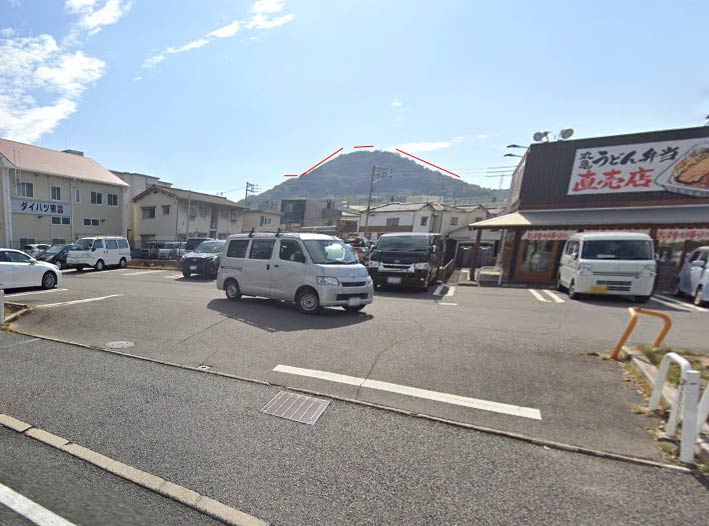 上述の黄金山の形状が確認できる場所は限られている。国道2号線沿いのストリートビューをみると、下の写真の方角から撮影されたのではないかと考えられる。