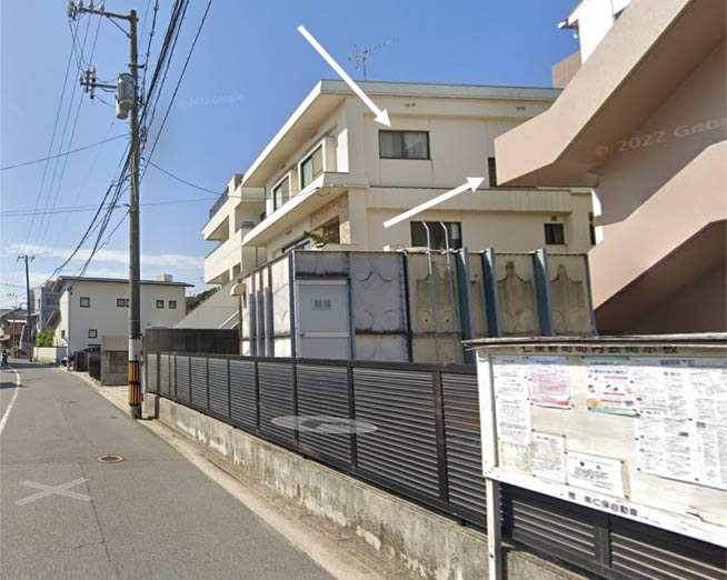 確認のため現地を訪れた。すると幸運なことに、背景の建物の住民と話をすることができた。結論はというと、この近くにMusic Cityと書かれた建物は存在しなかった。昔は田んぼばかりだったとのこと。また背景の建物は耐震補強工事を行ったことはなく、40年前から今と同じ形状とのことだった。