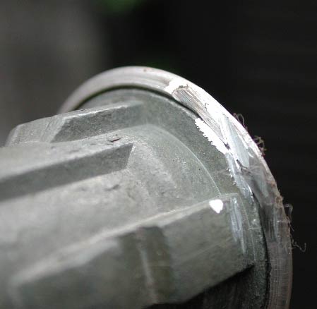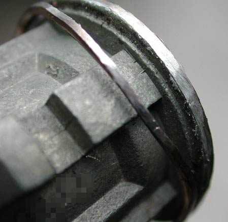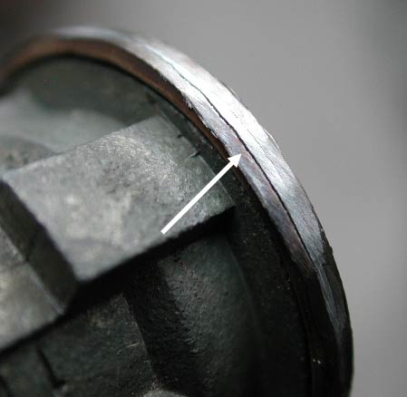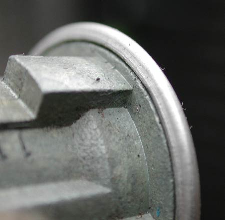 「蓋」の表面を徐々に削っていくと、矢印のような線が見えてくる。これはキーシリンダー本体と蓋との境目である。これが見えてきたら、これ以上深く削る必要は無い。またいくら削っても見えてこない場合、サンダーに強く当てすぎて、境目が潰れて見えなくなっている可能性が高い。その場合はこの部分の切削を中止して、他の部分を削っていく方がいい。