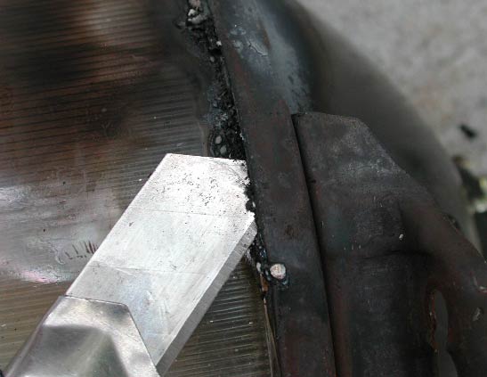 シールが燃え切ったら、カッターの刃をシール部分に入れ、燃えかすのシールを掻き出す。