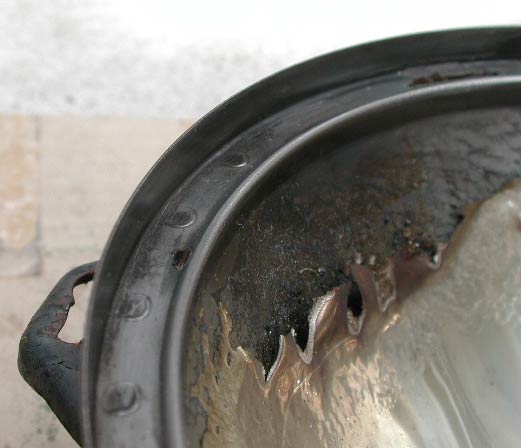 シールが付いていた部分。燃えかすを綺麗に取り除く必要がある。またメッキ部分に注目して欲しい。メッキが燃えているのだ。どうやらこのメッキは、金属に直接メッキされた物ではなく、樹脂製の反射膜が貼り付けられたもののようだ。だから「メッキが焼けて光量が落ちる」ということが起こるわけだ。
