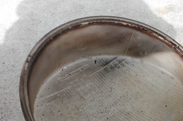 これらはパーツクリーナーを吹きかけて溶かすようにして取り除く。下の写真では、矢印部分にパーツクリーナーを吹きかけた。黒っぽいタール状のものが溶け落ちて、レンズ中央に貯まっている。またパーツクリーナーで取れない汚れは、スクレーパーなどではぎ落とす。