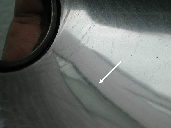 まずヘッドライトの筐体。メッキの仕上がりを左右するため、よく磨いておくこと。矢印は、反射している建物の窓のサッシである。最低限このくらい磨きたい。