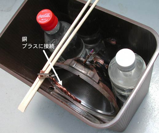 銅の電極。本来はメッキ用の銅板を使うが、不要な電線から取り出した銅線を使用した。