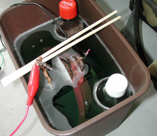 泡が無くなったら銅メッキ完了。電解液の色が緑色っぽいが、これはサンポールの色と銅イオンの色が混ざったためだ。