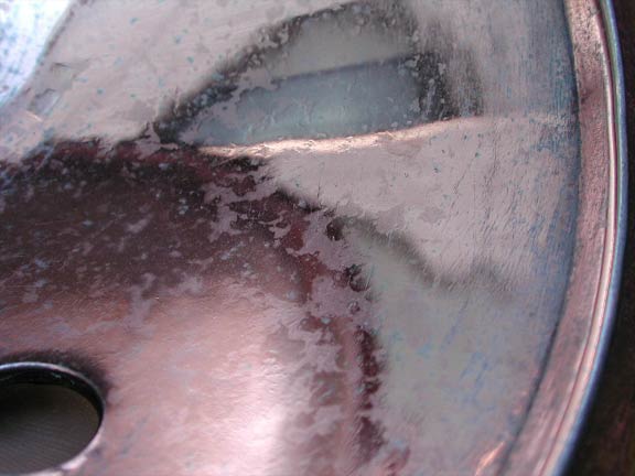 このガサガサ面をピカールで磨いていく。強く磨くと、また同じ場所を何度も磨くとせっかくの銅メッキが剥がれてしまうので注意。下の写真は途中段階のもの。綺麗に反射している部分と、そうでない部分がある。