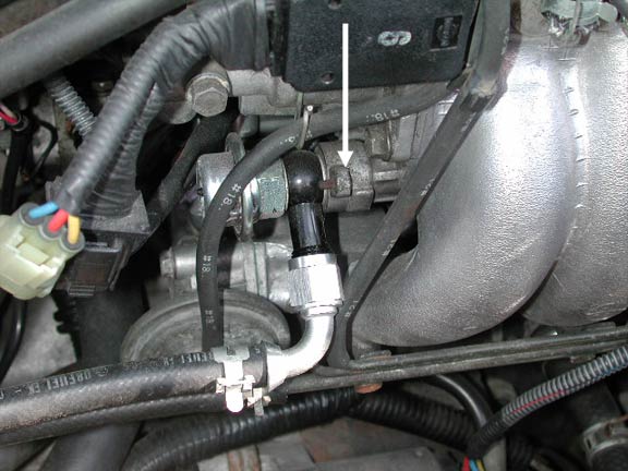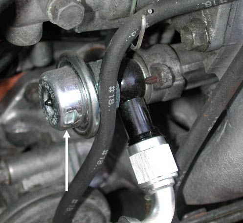 EA11カプチーノのデリバリパイプには、矢印で示すパルセーションダンパーがネジ留めされている。そのためパルセーションダンパーが劣化しても交換可能なのだ。なおカプチーノ純正のパルセーションダンパーは既に廃盤となっている。そのため取り付けているのはトヨタ用のもの(23270-74031)。