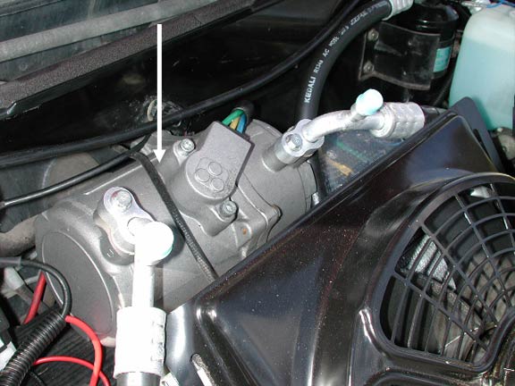 電動コンプレッサーを横から見たところ。今回の場合、ワイパーの下あたりにはまっている。