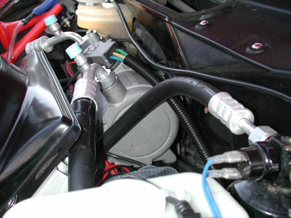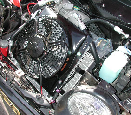 電動ファンがついているが、これはコンデンサー冷却用のもの。ファンの下にはコンデンサーがある。なお、ラジエター冷却用の電動ファンは純正品がそのままついている。つまり電動コンプレッサーにしようとすると、電動ファンが2つ必要ということだ。