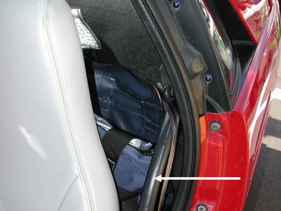 ここからがすごい。純正のエバポレーターが使えれば良かったのだが、うまく配管できないらしい。そのため、エバポレーターをシートの後ろに新たに設置し、そこまでの配管が車室内を貫いている。下の写真は助手席足下。