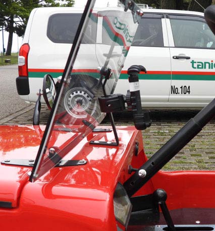 フロントガラス。アクリルガラスで可倒式となっている。倒して走行してみても良かった。