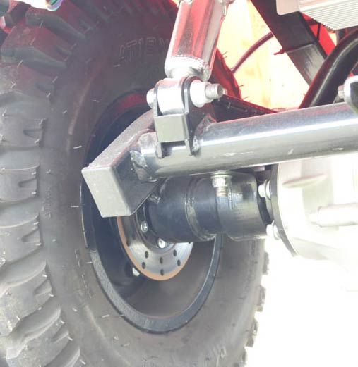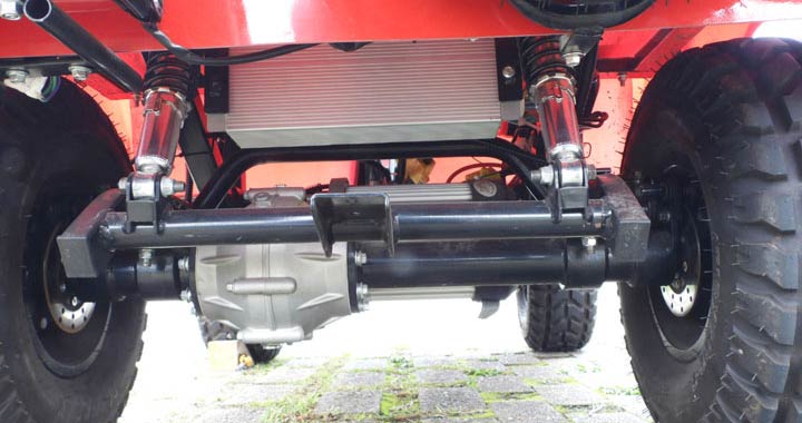 さらに下側から見ていく。シャシーのフレームの下に、ナックルやアブソーバーが取り付けられているフレームが別途存在する。そのフレームは中央矢印で示すスタビライザーのような物が繋がっており、前後の動きが規制されている。左右方向の規制はどうなっているのか、下の写真ではよくわからない。今になって気がついたので、もう少し写真を撮っておけば良かった。