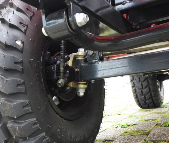 フロント側のサスペンションから見ていく。アブソーバーは、見た目鉛直に取り付けられている。ウイッシュボーンはもとより、ストラット、トレーリングアームでも通常は傾いているので、あまり見ることのない取り付け方ではないだろうか。