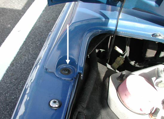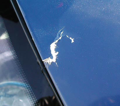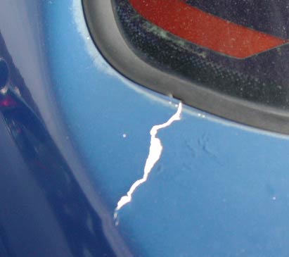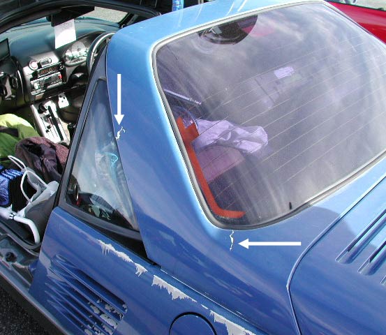 破裂した缶は、クオーターガラスを突き破り(写真左・ガラスは交換済み)、バックウインドウパネルまでめくれ上がったようだ。写真右の矢印部分はネジを示しているのだが、これも吹っ飛んでいたそうだ。