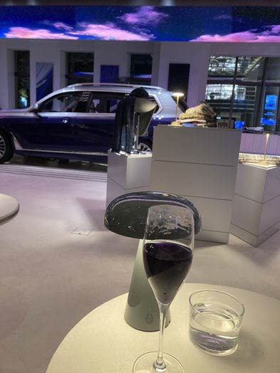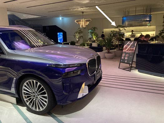 一杯飲むために夜に行った。出されたのはこのスパークリングワインをベースとしたスペシャルカクテル。展示してある、BMW X7 NISHIKI LOUNGEをイメージしたものなのだそうだ。スペシャルカクテルは、展示される車にあわせて都度変更されるとのこと。価格は1980円だったと思う。普通のカクテルは1400円だった。