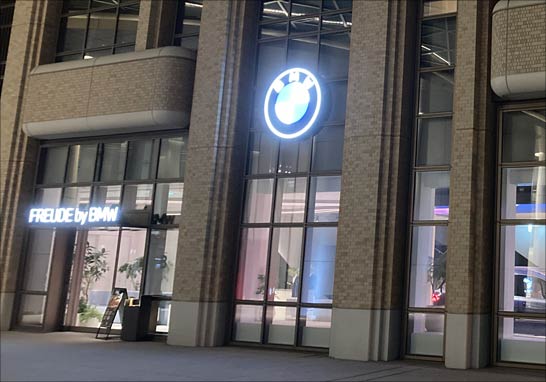 まず、外から見たときの店の佇まいが違う。MAZDA TRANS AOYAMAはマツダであることを感じなくさせるために、ブランドシンボルが2階のしかも店の中に飾られている。対してFREUDE by BMWは、BMWであることを強く意識させるようサイネージが掲げられている。