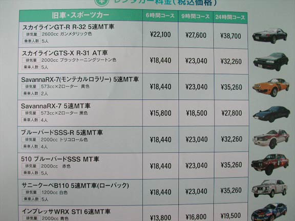レンタカー代金一覧。上記2台以外にもある。
